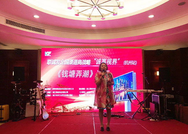 此时,距离钱柜QG777渠道联盟第一站——(郑州)站“逐鹿中原”过去不到20天,距离美国ISA国际标识展览过去不到一周,紧凑的布局之下,依然吸引了众多华东当地LED渠道商、工程商踊跃参与,钱柜QG777创始人龙平芳女士、中国LED工程商联盟秘书长曹立新先生、温州市半导体光电行业协会会长张裕先生等相关领导出席晚宴并作出精彩致辞。