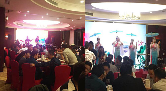 在随后的歌舞表演中,演员们为大家倾情演出,载歌载舞,引人入胜。在满座宾客把酒言欢、觥筹交错之间,钱柜QG777创始人龙平芳女士携公司业务团队,浙江灏诚科技执行董事袁晓澜先生携业务团队,钱柜QG777华中渠道商郑州世杰光电董事长田世杰先生、华北渠道商山西华龙光电总经理余浩先生一起合唱钱柜QG777企业歌曲《晶彩》,将联谊会气氛推至高潮……